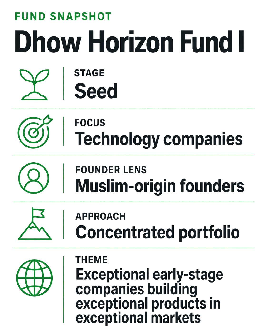 We’re launching Dhow Horizon Fund I, a $5 million fund designed to back early-stage technology companies with Muslim-origin founders, with a focus on high-potential AI businesses.